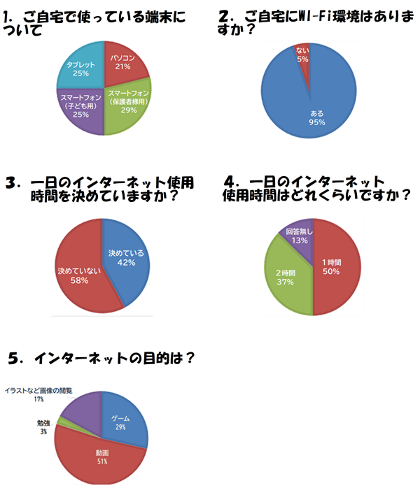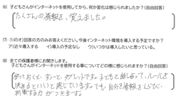 さて、ITを使用しての子供達の変化では、「たくさんの情報をITから得る事ができた」「目覚まし時計では起きないが、動画の音ですぐに起床する」「言葉を覚えた」「調べたい事があると自分で調べる力がついた」等の良い影響もある一方、目が悪くなった等のご意見もいただいております。