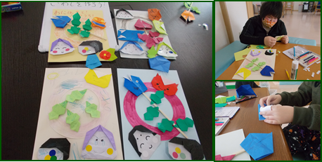 1月最終日は柊(ひいらぎ)鰯(いわし)というものを折り紙で作りました。 節分に魔除けとして使われ、玄関に置くことで柊のトゲが鬼の目を刺し、鰯の焼いた煙の匂いで鬼が逃げていくと言われているものです。 折り紙で鰯の頭や柊、鬼、お多福、恵方巻などを折って飾りました。