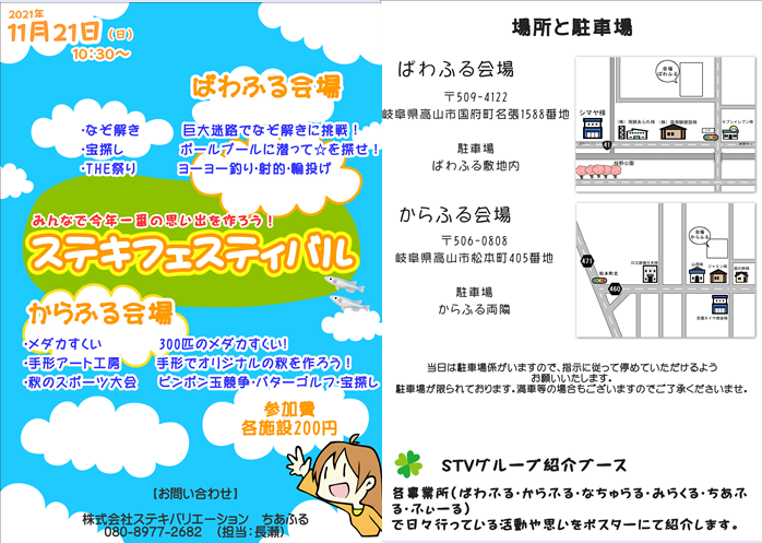 「非日常を体験して、今年一番の思い出を子どもと作ろう」をコンセプトに、11月21日(10:30~15:00)に開催します!! 「コロナでなかなか楽しいイベントに参加できていない...」そんな思いを払拭するような、楽しいイベントを多く企画しています! 「メダカ300匹・3000個のボールプール・手作りアート工房...」など親子で楽しむことができるものを準備しております。 会場は2施設に分けて、~各ブースにチャレンジ→スタンプをもらう~のスタンプラリー付きです!!! 是非参加をお待ちしております!