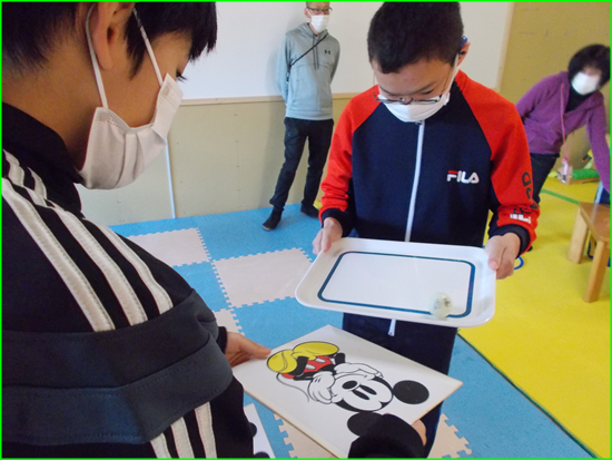 11月第1週目は「体操の日」です。準備体操として「ラジオ体操第一」を行った後、「ピンポン玉運びリレー」を行いました。スプーンで運ぶ人、お盆で運ぶ人、紙で運ぶ人の3チームに分かれて線の上を歩いてピンポン玉を運びました。「簡単!」という声が上がり紙から色紙に難易度を上げて行いました。 次の人にバトンタッチする時や、ピンポン玉を落とさないように運ぶにはどうすればいいのかなど、慎重に運ぶ中で子どもたちそれぞれが工夫して運ぶことが出来ました!
