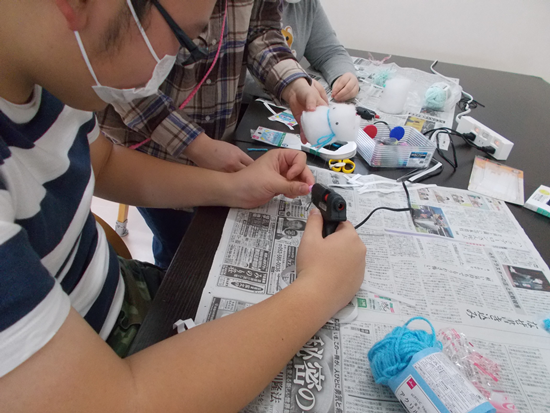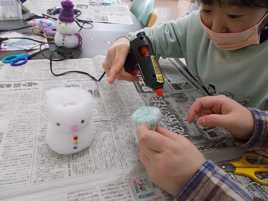 土曜日はアートデーということで、ヤクルトの容器やトイレットペーパーの芯を使って雪だるまを作りました。 ヤクルトの容器にキルト芯を巻き、トイレットペーパの芯を1センチに切り、毛糸を編んで繋げていき、最後にしばってポンポンを作りました。 雪だるまの鼻や目、ボタンはグルーガンでつけ、帽子をかぶせたら出来上がりです。みんなそれぞれ、かわいらしい雪だるまを完成させました。