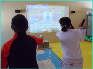 先日は「eスポーツ」の日でした。今日はモーションセンサーを使った「卓球」「チャンバラ」のゲームを体験しました。手を振ったりしてそのままゲームのキャラクターに動きが反映されるゲーム内容です。 操作説明は最小限にして、子供達自身が他児の動きを見て「どの様に腕を動かせばいいのか? 「どうしたら上手く返せるのか?」を考えてプレイしていました。 他児に聞いたり使い方を教えて助けてあげたり、子ども同士で工夫がみられました。 卓球はトーナメントで行い、応援しながら楽しみました。