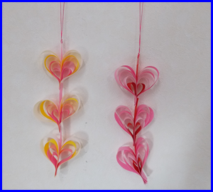 バレンタインデーにちなんでハート型の飾りを作りました。 紙テープの色を自分で選び、4種類の長さに切りました。ハート型にまるめてホッチキスで止めていきます。 ハートにまるめることが難しかったところは出来る子がお手伝いしてすてきな飾りができました。