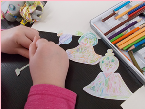 お内裏様とお雛様、ぼんぼりには子どもたちに好きな色で着飾ってもらいました。