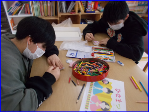 お内裏様とお雛様は様々な表情がみられました。台紙にのりで貼り付けるときも、お手本を見ながら行う子もいれば、好きな場所に置いていくなど、華やかな飾りが出来上がりました。