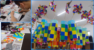 土曜日はアートデーということで季節を先取りして鯉のぼり制作をしました。今回の鯉のぼりはうろこの部分に番号を書き、その番号通りに折り紙を貼っていくというテーマに制作しました。 あらかじめ番号がかいてある台紙に1,赤 2オレンジ 3黄色という色の折り紙を貼っていく作業です。1の折り紙だけを先に貼っていったり、1,2、3と順番に貼っていったり、貼り方を工夫して、考えて貼ることができました。好きな色で塗ったしっぽと目でそれぞれのオリジナル鯉のぼりができました。