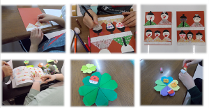 お雛様は顔の部分を丸く切る作業や、下から順番にレイアウトを考えて貼っていく工程や顔を書くという作業を丁寧に行いました。それぞれの顔が描くことができました。