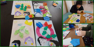 お雛様とお内裏様の着物は習字で使う半紙を使い、絵具で色をしみこませ、皆それぞれ自分だけの素敵な柄の着物を作りました。着物を染める時が一番難しく、絵具に半紙を染み込ませすぎると半紙がくっついてしまい、広げることが大変でしたが、スタッフの話を静かに聞き、丁寧に慎重に色付けをしました。