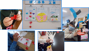 今月のぱわふる工房では、バレンタインデーにちなんでハートのオーナメント、自分の手の形で作るハートのメッセージ、そしてびっくり箱を用意しました。土曜日ご利用のお子さんは時間があり、色々作ることが出来ますが、平日時間がなくて作れないお子さんも、少しずつ作り、何日かかけて完成させています。