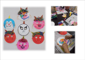 紙皿を自分の好きな色に塗り、毛糸で髪の毛を作り、角や輪ゴムをつけてオリジナルのお面を完成させました。