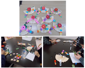 ぱわふるでは画用紙を折り、、折り紙で作ったツバキの花を飾り、自分の好きな折り紙で紙垂(しで)を作り、コヨリにシールを張って、オリジナルのしめ縄を完成させました。ぜひ、お正月におうちに飾ってください。