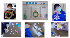 ぱわふるでは、みんなで作る楽しみを届けるために毎月3つずつ作品をピックアップしています。12月はクリスマスオーナメント、クリスマスリース、クリスマスツリーを作るように用意しました。やりたいものを自分で選び、スタッフがサポートをしながら完成させます。出来た!と言う喜びを味わってほしいと考えています。