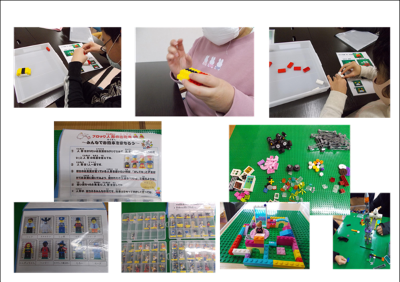 「木」や「お寿司」の見本の手順書を見ながら、作品を完成させました。ひとりでは完成できなかったりしても、手順書をみながら順番どおりに作れるか、スタッフと一緒に作れるか、普段ブロックに興味のない子もこの日はブロックというものにふれてみようという企画です。